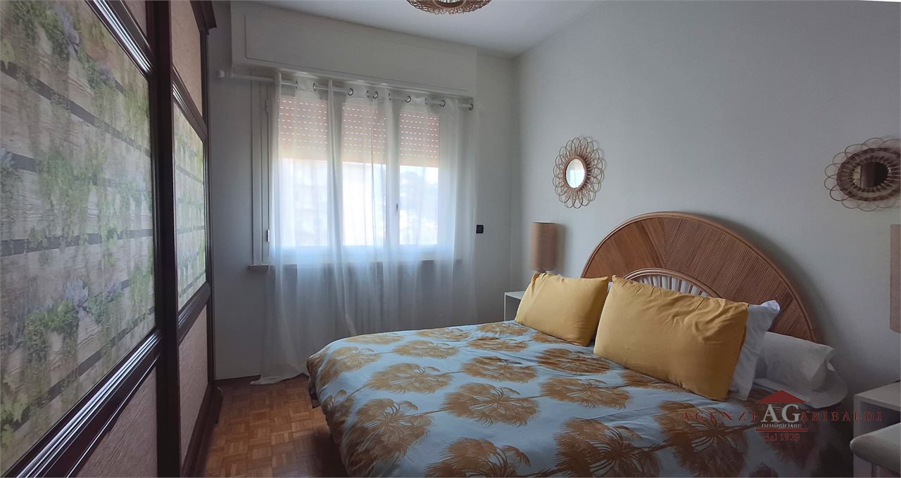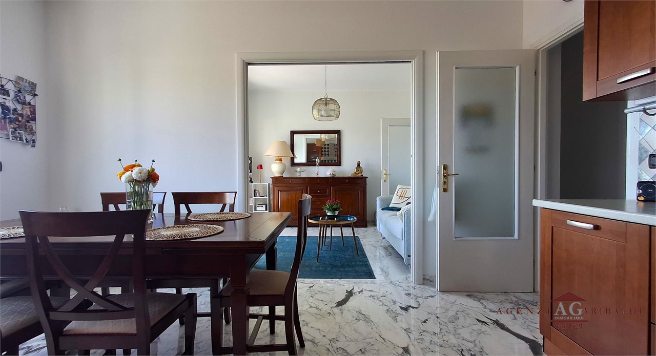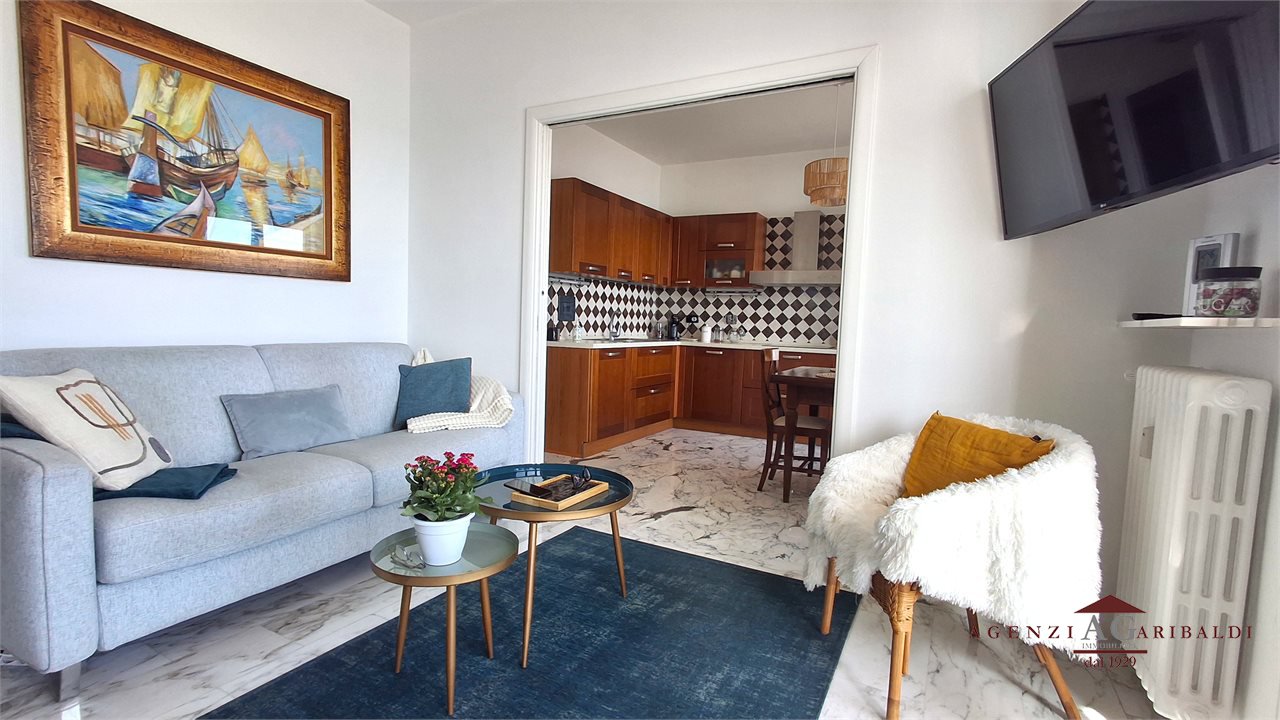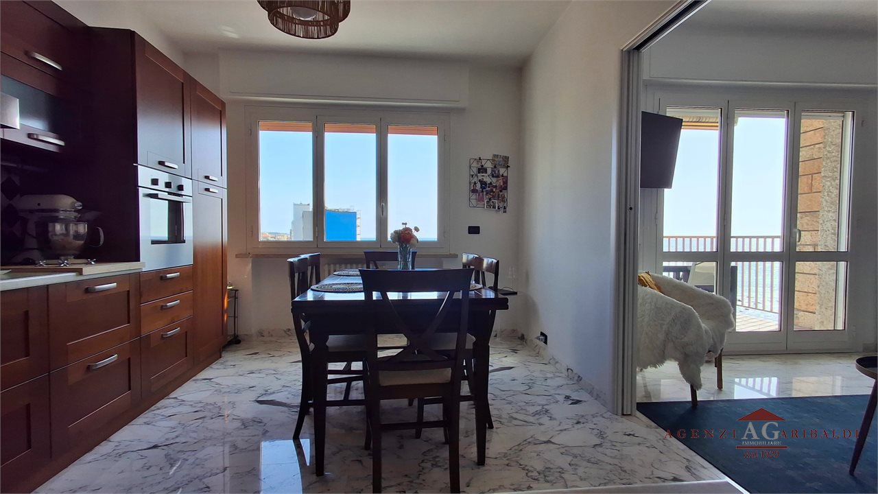L'ingresso su bel disimpegno permette di accedere subito al luminoso soggiorno aperto sul mare, ampio balcone comodo per godere il sole, cucina abitabile a vista che può essere chiusa da bella porta scorrevole.